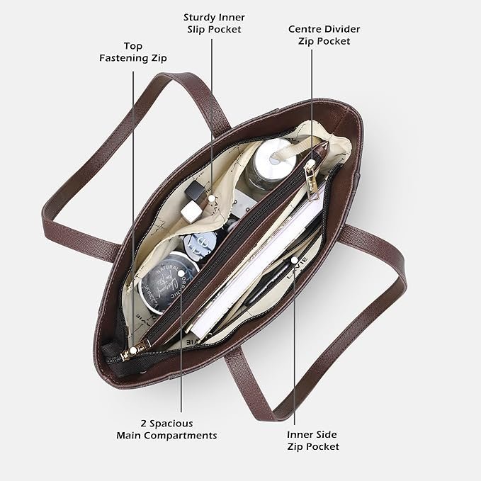 • Betula tote has a top zip closure to keep your essentials in place. The bag has spacious compartment with center divider pocket,inner side zip pocket & sturdy inner slip pocket; providing plenty space for keeping phone, portable charger, keys, hairbrush, wallet, sunglasses, sanitizer etc.