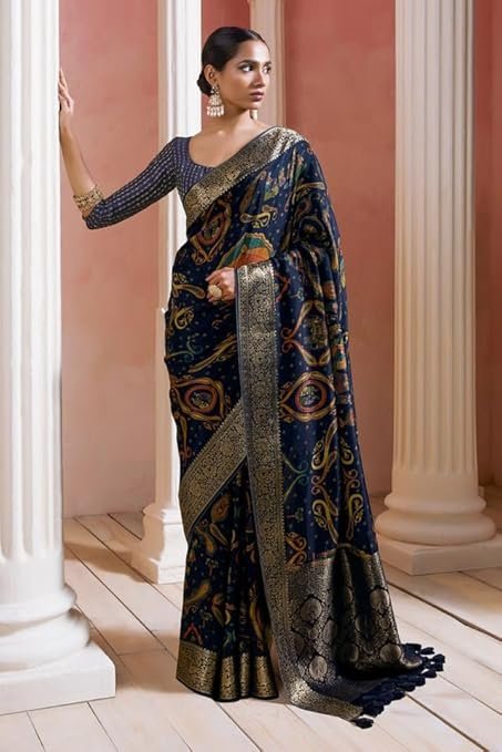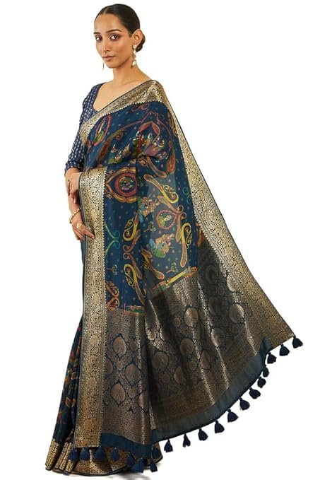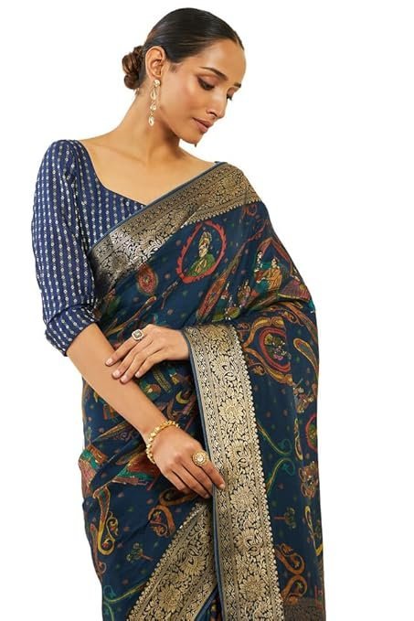 Soch Womens Navy Blue Crepe Saree With Ethnic Print And Zari Borders